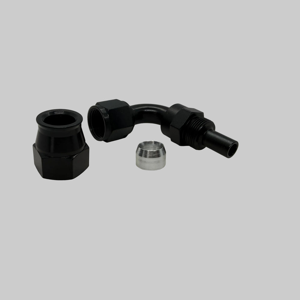 CNC-machined from lightweight aluminum with black anodized finish, this 90° swivel provides full rotation for easy alignment and strain-free hose installation — ideal for remote oil coolers, turbo oil drains, fuel returns, or catch can venting.