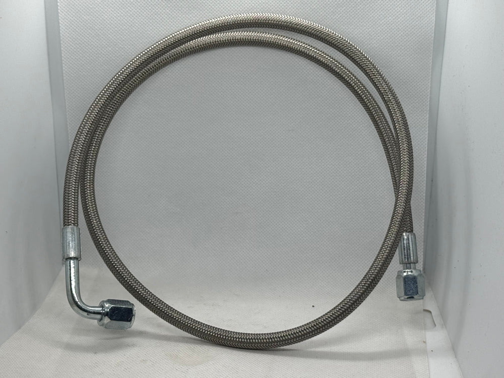 Upgrade your fluid lines with this versatile 36-inch (3-foot) PTFE lined hose assembly, featuring stainless steel outer braid for excellent durability and abrasion resistance. This mid-length configuration includes one straight -4AN swivel fitting and one 90-degree -4AN elbow swivel fitting, providing the perfect balance of reach and clearance for BK Racing oil line, clutch, and transmission vent kits or any setup needing a moderate run with angled routing around engine components, chassis rails, or firewalls.
